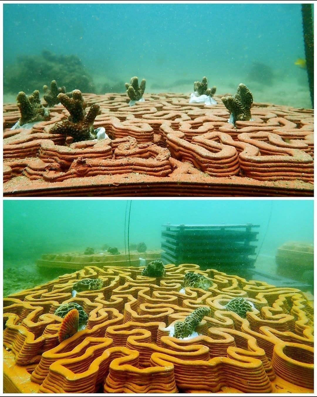 Sin embargo, el deterioro gradual por la bio erosión a lo largo de los años, junto con los eventos de blanqueamiento y la mortalidad masiva entre los años 2015 y 2016, han puesto en riesgo a la comunidad coralina local. En respuesta, el equipo de biólogos marinos y arquitectos ha desarrollado una serie de estructuras de arrecifes de terracota impresas en 3D para ayudar en la restauración de corales, proporcionando sustratos estructuralmente complejos en un área degradada.